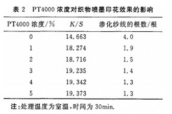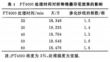 2.2.3PT4000处理时间的影响改变PT4000的处理时间,然后进行喷印.结果如表4所示.从表4可以看出,随着PT4000处理时间的增加,织物的K/S值有下降的趋势,而渗化的纱线根数基本不发生明显的变化.综合考虑颜色鲜艳度和对渗化性能的要求.PT4000处理织物30rain左右较为理想.