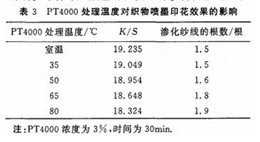 PT4000的处理温度,然后进行喷印.结果如表3所示.从表3可以看出,随着PT4000处理温度的提高,处理织物的K/S值下降,说明处理温度对
