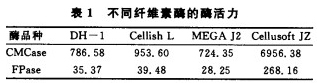 实验选择Suh0ngCellishL、MEGAJ2、DH-1和Cellus0ftJZ四种纤维素酶,分别用CMC酶活法(CMCase)和滤纸酶活法(FPase)测定其酶活,结果如表1所示。