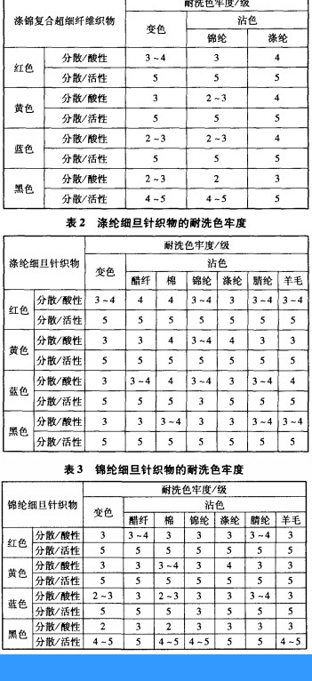 由表1~表3可知,Efio~st活性染料/TerasilW分散染料一浴法染涤锦复合超细纤维织物,可获得较高的耐洗色牢度,与传统的分散/酸性一浴法相比,能很好地解决涤锦复合超细纤维织物染色牢度差的问题。