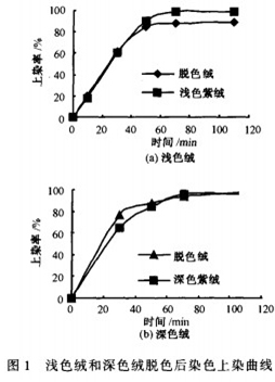 原绒色泽不同,相同漂白工艺处理后的白度明显不同。为了对其染色性能进行研究,选择酸性染料进行染色,分别比较了原绒和脱色绒应用酸性染料普拉红B染色的上染特性。图l示出浅色和深色绒脱色后的上染曲线。