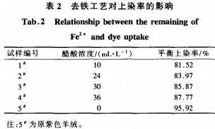 去铁处理时,采用不同用量的醋酸处理脱色绒,然后在同样条件下用Lanasol黄4G染色,测得平衡上染率,结果如表2所示。