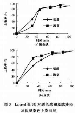 由于脱色处理使得羊绒染色的匀染性变差,并使纤维受到一定损伤,在染色过程中对温度十分敏感;所以,沸染工艺必然影响染品的品质,因此选择低温染色工艺具有显著的优越性。图3示出活性染料Lanasol蓝3G对脱色绒和原绒沸染及低温染色(85℃)的上染曲线。由图可知,原绒与脱色绒的上染曲线存在明显差异。原绒低温染色时的上染率比沸染时的上染率低,而脱色绒低温染色时的上染率在65min以前比沸染时的上染率高,平衡上染率比沸染时的稍低。