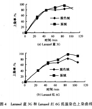 图4为Lanasol蓝3G、Lanasol红6G染料低温(85℃)下对脱色绒与原绒染色的上染曲线图。由图可看出,Lanasol蓝3G染料染脱色绒与原绒的上染曲线相近,匀染性良好;Lanasol红6G染脱色绒和原绒的初染率相近,但染色后期上染率及固色率稍低于原绒,染色均匀。
