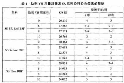 预处理工艺中助剂YH的用量直接决定了预处理织物染色的增深效果.并对染色样品的摩擦牢度有一定的影响实验以YH用量为变量.其他条件同l-3.采用1.3.1预处理工艺对纯棉针织物进行处理.并按照1.3.2染色工艺对织物进行染色.染色后与只经1.3.2染色工艺染色的织物进行对比.测试样品的K/S值和摩擦牢度.实验结果见表l。