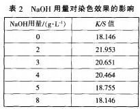 采用助剂YH对纯棉针织物进行预处理时.NaOH起到促进纤维对助剂YH的有效吸附作用.并促使助剂YH与纤维发生有效结合.因此NaOH的用量对预处理织物染色的增深有着重要的影响实验以NaOH为变量.选用SSBRRedBSF染料染色.其他条件同1.3.采用1.3.1预处理工艺对纯棉针织物进行处理.并按照1.3.2染色工艺对织物进行染色.染色后与只经1I3.2染色工艺染色的织物进行对比.NaOH用量对预处理织物染色样品值的影响结果见表2。