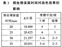 预处理保温时间的长短影响着助剂YH在织物上的分布状态实验以预处理保温时间为变量.其他条件同l_3.按照1.3.1预处理工艺对纯棉针织物进行预处理.并按照1‘3.2染色工艺对经预处理和未经预处理的织物进行染色.染色后测试样品的K/S值和摩擦牢度.实验结果见表3。