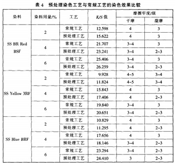 以上实验证明.与常规染色工艺相比.预处理染色工艺可以提高纯棉针织物对活性染料的吸附能力和得色率.有较好的增深效果。按照1.3预处理工艺和染色工艺进行实验.比较染料用量为2%、4%、6%.比较预处理染色工艺和传统染色工艺的染色效果,结果见表4。