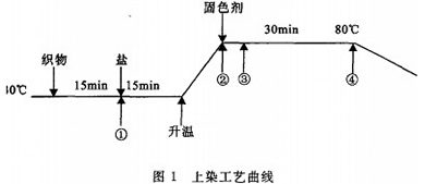 (1)染色工艺工艺处方:染料1%(o.w.f.),促染剂zg/L,碳酸钠10g/L,上染温度X时间:3O℃×30min,固色温度×时间:80"CX60min,浴比10:1.上染工艺曲线如图1.图1中①②③④为取样点.