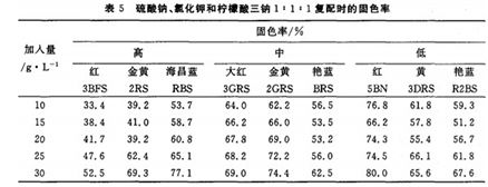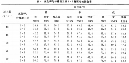 当氯化钾与柠檬酸三钠分别以不同比例复配时,如表4所示,具有相似的变化规律.特征值较高及较低的一类活性染料,其固色率随着盐浓度的改变均有较大范围的变化,比较敏感,不适合用于低盐染色;而特征值居中的活性染料,其固色率不仅变化不敏感,且盐用量均有所降低,固色率保持在60%0左右.