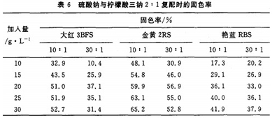 在硫酸钠与柠檬酸三钠以2:1复配作为促染剂,分别在浴比为lo:1,30:1的条件下对特征值中的染料的固色率影响,如表6所示.