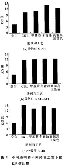 由图5a可知.对于高温分散红S-5BL来说.除了冬青油在常压沸染工艺中的染色深度高于高温高压染色的色深度外,助剂CWL、甲基萘均达不到传统高温染色的色深度:由图5b可知,对于中温分散红玉SE—GFL来说.助剂CWL、甲基萘、冬青油用于常压沸染的染色深度均与高温高压染色的色深度相当:由图5e可知.对于低温分散蓝E一4R来说.助剂CWL具有明显的增深效果.均比甲基萘、冬青油以及高温高压染色的色深度要深因此.助剂CWL比较适用于中温型和低温型分散染料的常压沸染工艺.染色深度完全可以达到高温高压染色的色深度。