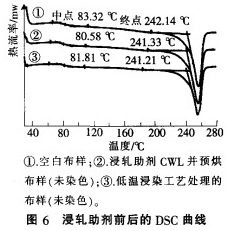 从图6可以看出.经助剂CWL处理后的涤纶纤维的玻璃化温度从83.32℃下降至80.58℃.低温浸染工艺完毕后玻璃化温度成为81.81c(二如果能排除操作误差及环境影响.则可降低得更多.说明助剂确实能够对涤纶纤维产生增塑作用.从而降低涤纶纤维的玻璃图6浸轧助剂前后的DSC曲线化温度.使其成为能够低温染色的一个原因。此外。涤纶纤维的熔点几乎没有改变.说明助剂的添加不降低纤维的熔点。