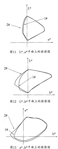 从上述体积数中可看出第二组染料体积要比第一组大一些,相差9.2%。由于体积大小表征染料的L*、a*、b*值在空间覆盖的范围,色空间的体积越大.所能够拼色的色彩范围越广所以理论上第二染料组的颜色表现范围比第一组要大一些为了更好地比较两个立体空问的形状.可通过投影图作比较从图11L*、a*平面上的投影图可以看出两组染料拼色空间区域基本一致.只是第二染料组在绿色方向拼色比第一组稍大些。从图12L*、b*平面上投影图可得到第二组在蓝色区域(b*方向)比第一组区域明显大。从图13a*、b*平面上的投影图也可看出第二组比第一组的投影面大.这进一步说明了第二组染料比第一组染料的体积大、色域广.有较大的颜色表现空间。因此第二染料组能适应颜色范围更大的四色印花应用.