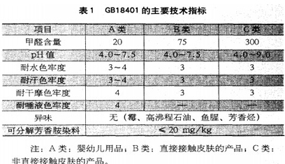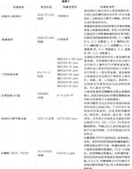 人类赖以生存的自然和环境正引起世界各国的广泛关注。中国作为全球最大的纺织品服装生产和出口国,针对纺织品和纺织化学品在使用过程中是否对人类安全健康以及生存环境带来影响,已逐步引起重视。各国纷纷制定出台相应的法律法规,以引起人们的高度重视。国际上具有代表性的是oeko—Tex标准100,它对130多种有害物质作了限量(或限制)规定。我国2003年颁布的GB18401--2003国家纺织产品基本安全技术规范(见表1),于2005年1月1日起正式生效实施。