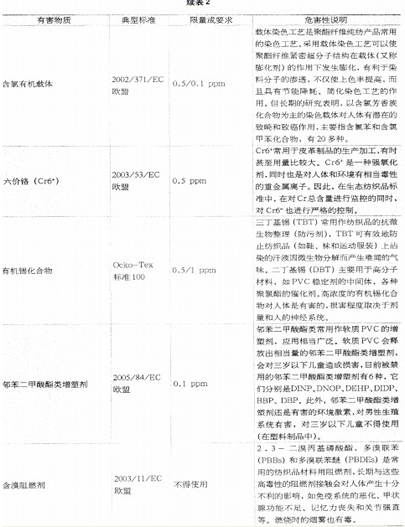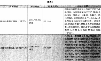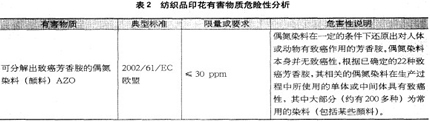 目前我国印花布主要用作服装面料(约占80%),而纺织品印花用着色剂主要是涂料色浆,我国约占23%(全球约占48%)。因此,选择和使用环保型的涂料色浆已经是行业发展的必经之路。我国目前每年对涂料色浆的消耗在4万吨左右,进口色浆占5%左右(以高档为主);国产以中低档为主。我国各涂料色浆生产企业尚存在规模小、品质监控手段不全面、环保意识差、管理不到位等不足,因此,部分国产涂料的环保性能是令人担忧的,但有些具备一定规模的企业(如上海油墨泗联化工有限公司)的产品已经过10多年市场考验,环保性能已得到用户认可。那么,对于印花或印染单位来说,如何认识涂料色浆的环保性能,有的放矢地使用是极其关键的。这里列举国内外具代表性的法律法规,针对纺织品印花范畴的有害物质,从限量要求和危害性作简要分析,以求共勉,见表2