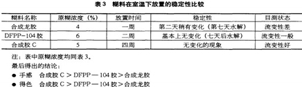 由于色浆中常需加入各种组剂,因此糊料对化学性能的稳定也非常重要,我们在三种糊料中分别加入各种电解质(2%H2SO3,,5%NaOH,5%HC1,5%SnCl,2,5%Na,2SO3)放置4天后均无变化,无水解现象。说明三种糊料与上述化学组剂相容性均好。