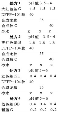 首先配制冰浆染料,采用合成胶C制糊,浓度为5%,冰水搅拌1.5h后,呈透明的浅棕色,悬棒滴降呈线状即可;用温热水搅拌1h,使用原糊时应先用冰醋酸调节pH值4~5。使用相同的原料,且都在同样的承印物上印刷,可以采用以下几种冰浆印花工艺。