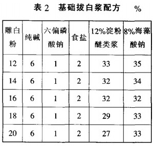 对于白度要求不高的拔白.则处方中纯碱的用量可降低到2%如果是深底色的拔白.用基础拔白浆不能保证拔白度.可以在基础拔白浆里加一些增白剂.来提高白度。