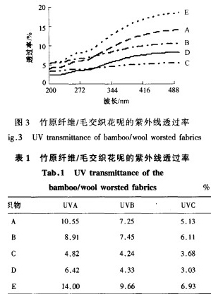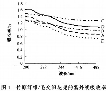 5种织物的紫外线吸收率曲线参见图l。可以看出,在UVA(波长400~320nm)、UVB(波长320~280Nm)区域,C面料紫外线吸收率最高,接下来依次为D、B、A、E面料。分析原因:织物色泽对紫外线的吸收有一定影响,C面料含毛纱比例较大,颜色较深,其对紫外线的吸收最多;但在UVC(波长280~200Nm)区域,D面料紫外线吸收率最高,接下来依次为C、A、B、E面料。D面料即含50%竹原纤维的竹原纤维/毛交织花呢对紫外线的吸收性能,尤其是对UVC波的吸收存在明显的优势,即D面料具有较好的紫外线防护性能,这可为竹原纤维在精毛纺中的应用提供参考。