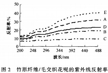 紫外线反射率曲线参见图2。可以看出,面料对紫外线反射率从高到低依次是E、A、D、B、C。对比各织物竹原纤维含量可以得出,竹原纤维含量越高,织物对紫外线的反射性能越好。
