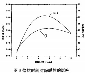 当焙烘时间分别为Omin、1min、lOmin时,对织物保暖性的影响如图3所示。