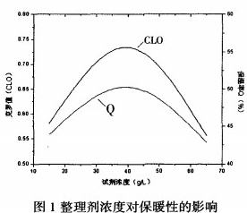 从图1可以看出.随着整理剂浓度的增大,整理后织物的保暖率和克罗值变化趋势相同,均先增大后又降低。主要原因是整理剂浓度越大,织物表面形成的薄膜也越粗糙,使得纱线间形成较大空气层,其中静止空气增加,直接导致织物保暖性随整理剂浓度增大而增大:但随着整理剂浓度进一步增大,整理剂中越来越多的中微小颗粒渗入纤维空隙中,减少了纱线间的静止空气,保暖性变差。故确定整理剂适宜浓度为30~40g/L。
