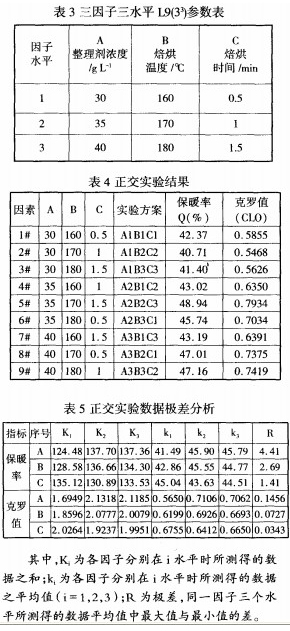 由上述单因子实验得出整理后织物保暖性较好的自清洁整理参数,为了确定复合功能整理使保暖性损失最低的最佳整理工艺,我们对其进行正交实验并测定织物保暖率和克罗值。根据上述单因子实验结果和规律分析,制定已经过抗菌整理的织物进行自清洁整理的三因子三水平见表3,正交实验结果见表4.极差分析见表5。