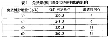 在亲水整理剂20L和焙烘温度180℃的条件下,改变免烫助剂用量,考察其对织物弹性和亲水性能的影响,结果见表1。