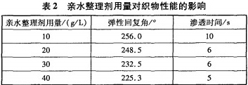 在免烫树脂4Og/L和焙烘温度180℃的条件下,改变亲水整理剂FMW用量,考察其对织物弹性和亲水性能的影响,结果见表2。