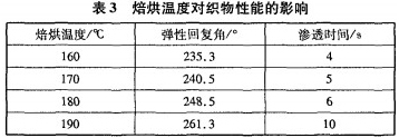 在免烫树脂40g/L和亲水整理剂20L的条件下,改变焙烘温度,考察其对织物弹性和亲水性能的影响,结果见表3。