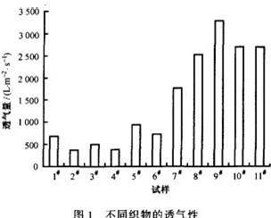 从图中可看出,1、2、3、4、5、6试样的面密度和厚度相当,5试样即纯珍珠纤维针织物透湿性略好于粘胶织物,优于珍珠纤维/棉和其他几种织物,珍珠纤维/棉织物的透湿性不如莫代尔/棉织物可见莫代尔织物的透湿性优于珍珠纤维织物;5、6、7、8试样的透湿性相近;通过比较试样10和11,可以看出珍珠粉的混入,使粘胶长丝针织物的透湿性有了略微的改进。