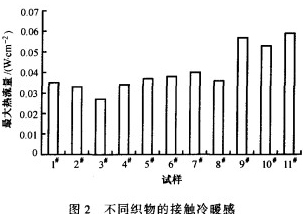 比较5和6或10和11试样,均可以看出珍珠纤维针织物的瞬间最大热流量略小于粘胶织物,即接触的瞬间珍珠纤维织物会比粘胶纤维稍暖。前8个试样的最大热流量排序为:莫代尔>粘胶>纯珍珠纤维>丽赛>莫代尔/棉>珍珠纤维/棉>纯棉>牛奶纤维/毛/棉,可见纯莫代尔织物较“冷”,牛奶纤维/毛/棉针织物较“暖”;长丝织物均较短纤织物凉爽。
