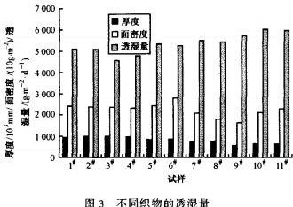 不同织物的透湿量测试结果见图3。为便于比较,图中厚度和面密度的曲线为相对位置。