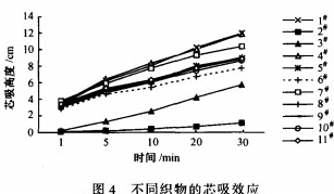 从图中可看出,1、4、7试样的芯吸高度明显高于其他织物,可见珍珠纤维/棉、莫代尔/棉、纯莫代尔织物的吸湿性优良,再生纤维素纤维与棉混纺的针织物有着良好的吸湿性能;纯珍珠纤维、珍珠纤维/棉织物均优于粘胶织物,5、8、9、10、11试样的吸湿性相差不大,2、3芯吸效应最差。