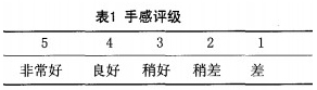 (9)手感评级:从柔软性、丰满感、滑爽感三方面进行手感评级,共分5级,1级最差,5级最佳,见表1。
