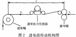 张力产生的根本原因是由于生产线前后存在着速度差,要想控制张力恒定,就要控制速度差恒定。将进布段传动机构简化如图2所示,以进布段的织物张力为例,分析张力控制系统的工作原理。