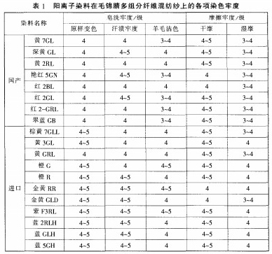 从表1中得出.所选择的染料在腈纶染色过程中.对羊毛沾色比较小.沾色牢度在3-4级以上.而其他的各项染色牢度良好。