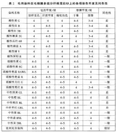 从表2中得出.所选择的染料本身的各项染色牢度良好.但是部分毛用染料对锦纶上染性有一定的影响.使羊毛和锦纶纤维的同色性有不同程度的差异.可以通过加入一定量的锦纶阻染剂来改善。