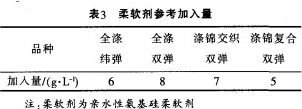 含有改性涤纶的涤锦弹力织物.经干热定形以后的手感会逊于锦纶弹力面料。定形之前浸轧少量柔软剂.以此来弥补稍显不够滑爽的手感.并进一步降低织物本身与检验织物之间的摩擦力.来提高被检织物的摩擦牢度。无论是哪一种弹力面料.柔软剂的加入量以成品布面不会轻易扒丝为准织物表面的扒丝程度.一般由客户和定形工序的班长共同确定。也可据此来确定该客户产品柔软剂的加入量。柔软剂的参考加入量见表3。
