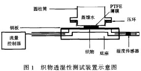 测试装置主要由铝合金圆柱筒和底座组成,其示意图如图1所示。圆柱筒中部有一外凸缘,底部包覆一层防水透湿PTFE薄膜,薄膜通过压环固定在圆柱筒的外凸缘上,压环与圆柱筒的外凸缘通过螺钉连接。往圆柱筒内倒入一定量的蒸馏水,液面高度低于凸缘高度,由于PTFE薄膜微孔直径为0.3tLm,而水滴的直径一般在100um,水蒸气直径为0.0004m,因此液态水不能透过FE薄膜,水蒸气可以通过该薄膜,以此生成饱和水蒸气。圆柱筒内水温由一热电偶测量,在底座上面刻有一浅槽,浅槽的大小为:宽0.02m,长0.1m,高0.OO4m,浅槽的两端分别与开在底座两侧上的进气孔和出气孔连通,进气孔连接流量控制器,在浅槽上面放一块不锈钢板,其尺寸和底座一样,钢板中央有一长方形的孔,其大小为:长0.06m,宽0.02m,待测试样位于钢板上并覆盖长方形的孔,因此钢板中央长方形孔决定试样透湿面积大小,即0.0012m,圆柱筒组合体位于钢板上,用螺栓将圆柱筒固定在底座。干燥氮气流通过流量控制器由底座的进气孔流进,经过浅槽,即试样的下方由出气孔流出,水蒸气在浓度差的驱动下由PTFE薄膜经过试样扩散到氮气流中,通过检测出口氮气流的相对湿度来确定试样的透湿量。