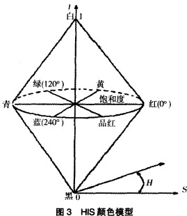 H、I、S颜色模型定义在圆柱坐标系的双圆锥子集上(图3)。色度日由水平面的圆周表示,圆周上各点(0360~)代表光谱上各种不同的色调;饱和度s是颜色点与中心轴的距离,在轴上各点饱和度为0在锥面上各点饱和度为1;亮度,的变化是从下锥顶点的黑色(0)逐渐变到上锥顶点的白色(1)。HI模型中,亮度,不受其它颜色信息的影响,可减少外界光照强度变化所带来的影响,因此选择此模型作颜色的量化。