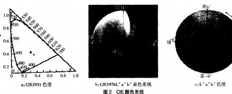 CIE1976L*a*b*空间可由CIE—xYz转换得到,L*a*b*表色空间又称为独立色坐标(图2b),它是把颜色按其所含红、绿、黄、蓝的程度来度量的。