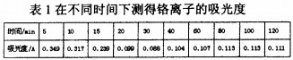 经测定后,各时间点的吸光度如表1所示,吸光度越小,则铬离子浓度越低。