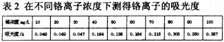 经测定后,各浓度的吸光度如表2所示,吸光度越小,则铬离子浓度越低。