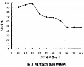 图3显示了最佳pH条件下菌体对不同浓度铬的吸附效果。铬浓度在10—60mg/L的范围内,菌体对铬的去除率均在60%以上,浓度为100mg/L时,去除率亦达到了46%。随着铬浓度的增加,微生物酵母菌的吸附活性也随之改变,当铬浓度为30mg/L时菌体对铬的去除率最高达到了97.15%。