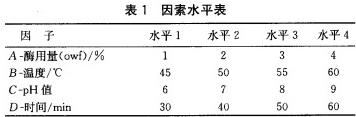 利用正交试验来确定最佳工艺配方,正交表选用L(4),选取温度、酶用量、pH值和时间4个因素作为正交试验的4个因子,选取各因子的4个水平进行正交优化实验。因素水平如表1所示。