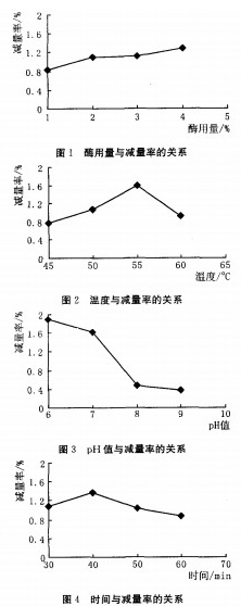 图1中,随着酶用量的增加,减量率也不断增加,但增加的幅度在不断减小。这是由于酶在催化反应时先与底物形成复合物,然后复合物分解再释放出酶和产物。底物的数量是一定的,当酶浓度较低时,随着酶浓度的增加减量率也增加,但当酶浓度达到一定程度时,减量率上升趋于平缓。