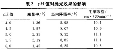 纤维素酶有一个最适pH域,在此条件下酶催化有最大的速度。本实验在酶用量2%,温度5O℃,时间50min,浴比1:15条件下,通过改变pH值(醋酸一醋酸钠缓冲液调节)进行生物抛光处理,结果如表3所示。