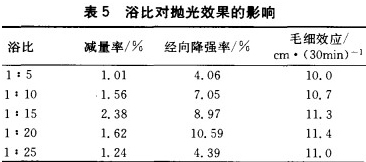 表5数据说明,对试验织物处理浴比为1:15时效果最好,此时织物的毛效最好,减量率最大,强降率较大,但不影响织物的服用性能。当浴比小于1:15时,织物和酶液接触不充分,易造成织物减量不均匀。当浴比大于1:15时,相当于酶浓度减少,减量率下降,没有达到处理的最佳效果,同时也造成了不必要的浪费。故宜选浴比为1:15。